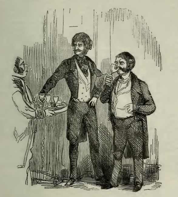 Lord Steyne, the scar on his forehead visible from when Rawdon Crawley threw his diamond back at him, drinks from a wine glass at Prince Polonia’s entertainment. He is standing next to a taller man, who is reaching out to take a glass from the tray a nearby serving man holds.
