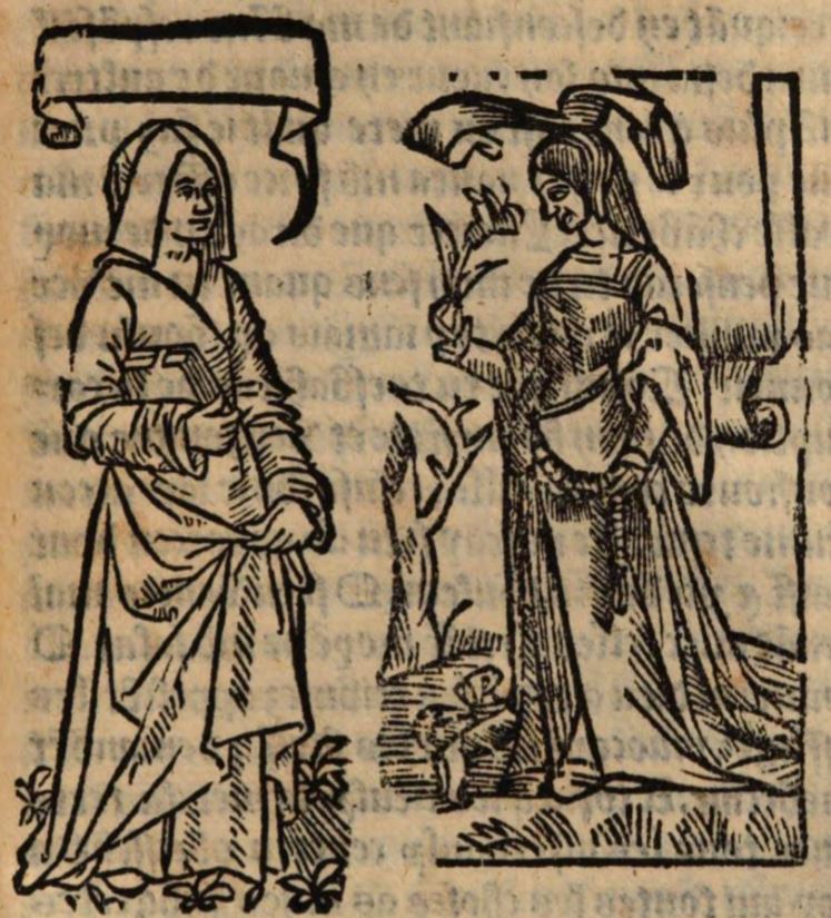In the left panel, we see a female figure wearing a robe and a veil. She is holding some sort of book between her body and her right arm. To the right, another female figure is shown in similar (although fancier) attire. In her right hand she is holding a flower, while in her left she is holding the girdle cord hanging from her waist. At her feet, a dog is standing on its hind legs with its front paws extended toward her. Both figures are placed outside.Because this act includes four female characters who all speak amongst each other, it is impossible to identify exactly whom either figure is meant to represent.The entire image is nearly identical to the one found on page 82 (where each figure is given a name label).The panel to the right is a near carbon-copy of a panel found multiple times throughout the earlier 1529 Lyon edition. However, the lower attention to detail in this panel makes it clear that it is a reproduction and not a duplicate. The artist likely referred to a copy of the 1529 edition when creating this panel.