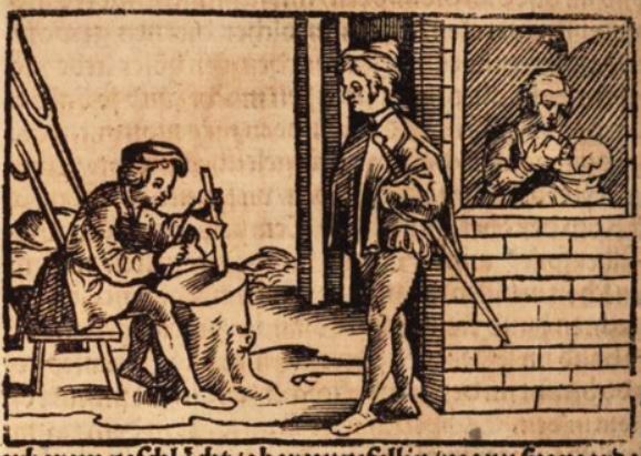 This engraving depicts the story of a young Roman woman who saved her mother from starving to death. Boccaccio explains that this unknown woman’s mother had been sentenced to death, and when she was locked away to die of starvation, her daughter saved her with her own breast milk. The girl and her mother are depicted behind the window of the jail cell as the mother drinks the milk of her daughter’s breast. The men that are standing guard outside the prison cell seem unconcerned and relaxed. One of them is leaning against the wall while the other one is sitting and sharpening a stick with an axe. They are unsuspecting of the young woman because they searched her every time that she visited her mother and she never seemed to carried food with her. Boccaccio believed this woman to be praiseworthy because of the woman’s filial devotion to save her mother.