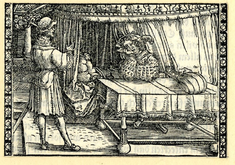 After his brief encounter with Melibea in her garden, Calisto (figure to the right) laments the absence of his love. Calisto’s servant Sempronio (on the left) proposes that he employ the help of Celestina, an old procuress and brothel owner. Calisto agrees, and he tells Sempronio to visit Celestina and request her aid. When Sempronio departs, Calisto’s other servant Pármeno warns Calisto against the old woman’s deceptive and treacherous ways.