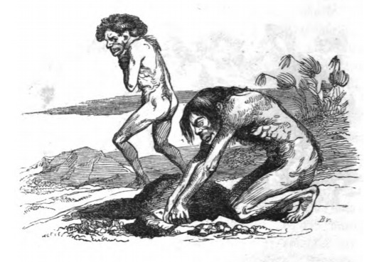 Here we see yahoos digging for gemstones. Gulliver’s master explains the relationships among the yahoos in the Country of the Houyhnhnms. Gulliver’s master says that the yahoos enjoy digging for various stones, which they would then fight over. The same image appears in the 1843 Krabbe edition.