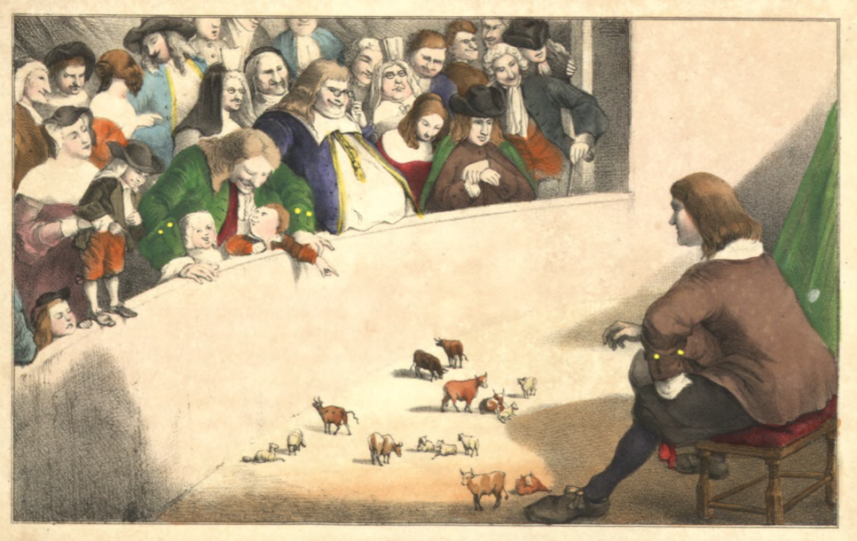 Here we see Gulliver showing off Lilliputian animals after returning to England. Gulliver sits on the inside of a pen surrounded by eight cows and seven sheep. Gulliver brought these animals back with him after leaving Blefuscu. A crowd of spectators look over a wall at the miniature animals. This image appears before the text of the story, foreshadowing Gulliver’s return to Europe and what he did while in England.