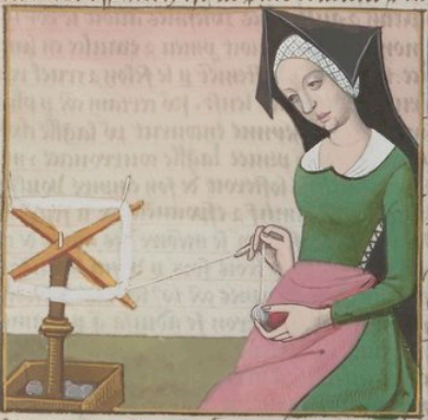 This illumination depicts the freedwoman Epicharis sitting down will spinning wool. Epicharis was a famous freedwoman who bravely endured torture for information regarding a conspiracy to overthrow Emperor Nero. Epicharis endured torture without giving the names of any of the other conspirators. Epicharis hung herself after being tortured twice, as she was scared that she would reveal the names of the conspirators if she were to be tortured again. Boccaccio explains that she is praiseworthy for her bravery and manly resilience.