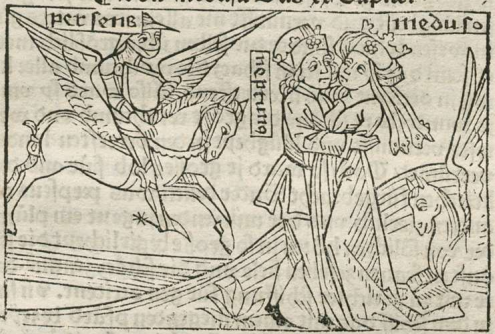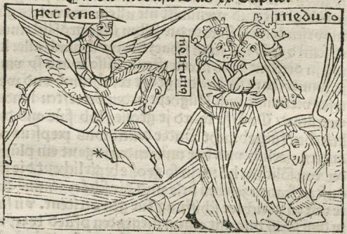 Medusa is illustrated on the right side of the engraving embracing the god Neptune. The creator engraved Medusa and Neptune’s names beside their bodies to identify them. Medusa is depicted in her human form in this engraving before Minerva transformed her into a monster. Boccaccio explains that Minerva transforms Medusa into a monster because she was angry that she had sexual relations with Neptune inside one of her temples. Boccaccio also explains that Medusa ends up giving birth to a Pegasus, which is engraved behind Medusa on the right side of the engraving. The hero Perseus is depicted riding his Pegasus on the left side of the engraving as he is on his way to conquer Medusa’s kingdom. Perseus’ name is engraved to the right of his helmet.