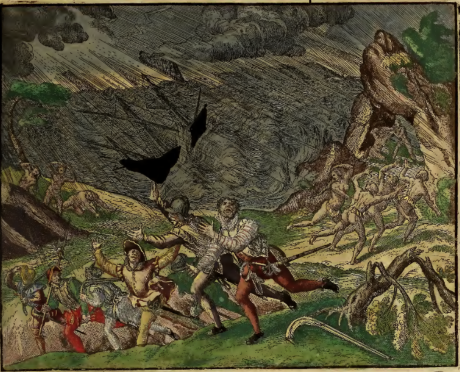 A violent storm hits the island of Hispaniola, capsizing a European ship and knocking down trees. A group of Spaniards flee the hurricane to the left and a group of Indigenous people run to the right amid the driving rain. Lightning forks through the sky and large waves lash the shore. This image is identical to one found on page 169 of Frankfurt, 1594, but colored.