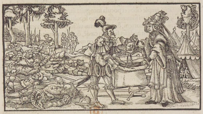 Thamyris, on the right, was the famous queen of Scythia. Cyrus, ruler of Asia Minor, was conquered by Thamyris’s armies after killing many of her men, including her son. Cyrus was killed in the defeat, and Thamyris had his head cut off. In the image, Thamyris places Cyrus’ head (center of the image) in a leather bag with the blood of her men, so that he would forever be surrounded in the blood he desired. Around her are the bodies of Cyrus’ defeated army, and one of her men (left of Thamyris) helping her place the head in the bag. In the background are the survivors of her army which defeated Cyrus.