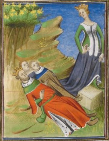 This illustration depicts Niobe, queen of Thebes, on the right side of the image with her children and husband lying dead in front of her. Niobe had many sons and daughters with her husband which made her incredibly proud. Boccaccio explains that when the city of Thebes was making sacrifices to Latona, the mother of Apollo and Diana, Niobe declared that she was more worthy of the sacrifices than Latona because she had more children than her. Every one of Niobe’s children died of the plague as punishment for her hubris against the goddess. Niobe’s husband, King Amphion, killed himself after all their children died, which is why he is depicted laying among the dead children.