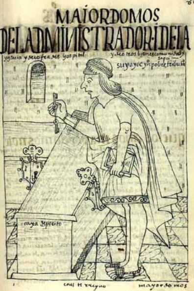 This image depicts a church administrator holding a key ring with two keys on it in his right hand and a book in his left. He is standing in front of large chests that have key holes on it. They are labelled as, “caxa, depocito” [box, deposit]. The official is dressed in an embroidered unku [tunic] and has a cloak draped over his shoulder. The author explains that this official was responsible for community well-fare, safekeeping the church’s depositories, confraternities and hospitals. The caption at the bottom of the image reads, “en este rreyno” [in this kingdom].