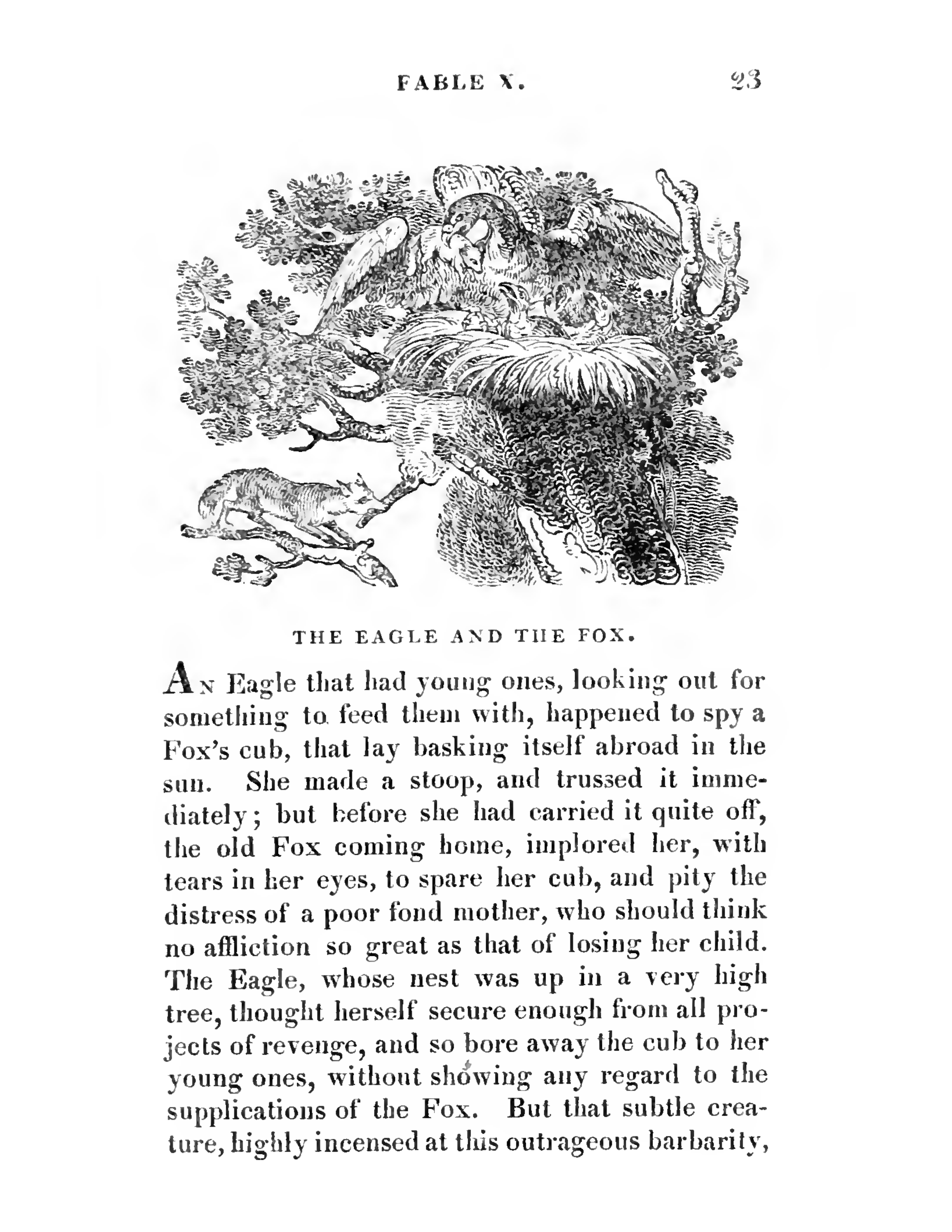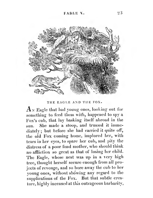 The main image concentrated at the right side of the illustration. On the left, there was a tree with the Eagle's net and her young ones. The Mother Eagle peaked a young fox to feed her ravenous youths. Their had their beak wide-openned and eagle to eat. At the bottom of the illustration, The Fox approached the tree for revenge, holding a lit torch.