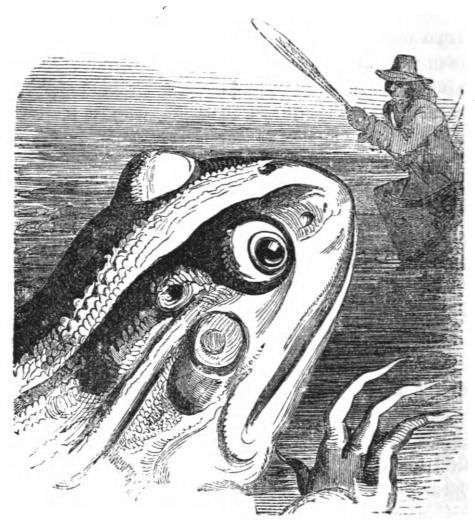 [A giant frog from Brobdingnag looks at Gulliver in his boat]