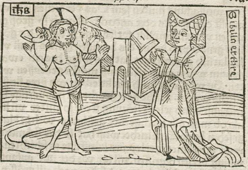 This engraving depicts the sibyl named Erythraea on the right side of the engraving with her fingers pointing to the man on the left side of the engraving. We know that this is the sibyl Erythraea as her name is engraved directly beside her body. The man she is pointing to is the son of God, Jesus. His name is engraved beside his head. Boccaccio explains that Erythraea was so intelligent that her prophecies were taken as Gospel rather than fortune-telling. She even prophesized the entire events from the life and death of Jesus, which is why he is depicted in this engraving. Boccaccio explains that Erythraea had also prophesized the fall of Troy, which is assumed to be the city in the background of the engraving. There is an unidentified man’s head engraved beside Jesus.