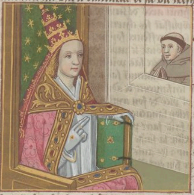 In order to follow her lover to England while he attended school, a maiden named Joan disguised herself as a man and went to school to be with her lover. Joan had excelled in academics and became incredibly knowledgeable. Continuing to dress as a man, Joan rose through the church and was eventually elected to succeed as Pope, known as Pope John. Pope John (Joan) is illustrated on the left side of the image dressed as a man while wearing papal regalia and the triregnum on her head. There is a man on the right side of the image looking at Pope Joan. She eventually exposed herself by giving birth in a public procession.