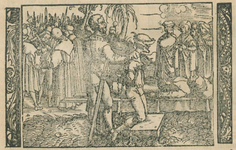 After murdering Celestina, Pármeno (lying dead on the stretcher) and Sempronio (on his knees in the foreground) jump from a third storey window in her house and are captured by the alguacil’s (justice’s) men. The justice then sentences them to execution by public decapitation. Crowds gather to witness the proceedings (as seen in this illustration). Sosia, one of Calisto’s servants, witnesses the event and rushes to inform his master. Tristan, another of Calisto’s servants, sees Sosia walking toward the house in tears and asks him the nature of his sorrow. Sosia explains the events that had unfolded. They ascend to Calisto’s bedroom and inform him of the tragic news, and he becomes melancholic. When he asks the cause of their execution, Sosia explains that they murdered Celestina because she would not give them their share of Calisto’s gold chain. Calisto blames the unfortunate circumstances on Celestina’s treacherous and deceptive ways.