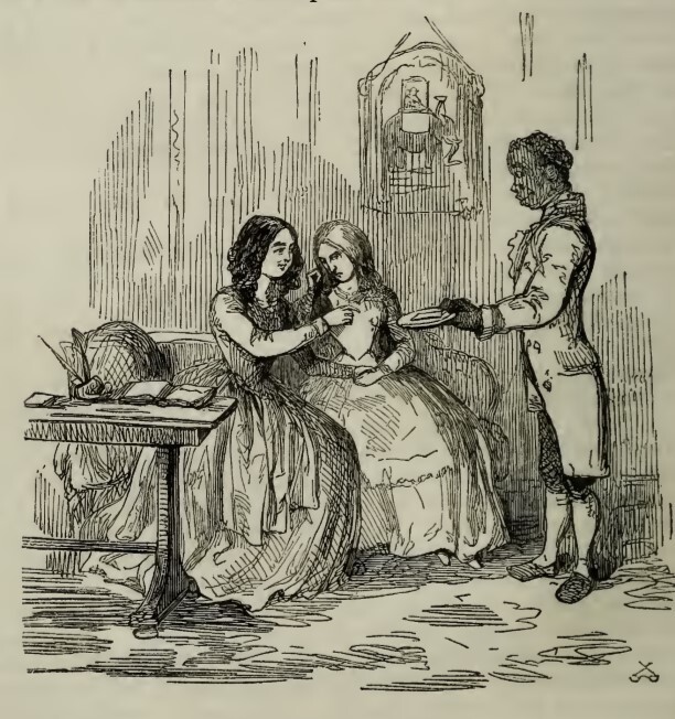 Sambo, standing on the right, presents a platter on which rests a letter for Miss Amelia Sedley from her brother. Amelia, who is reaching for the letter, sits on the sofa next to Rebecca Sharp. Both look concerned. On the wall behind them is a portrait of the man in question atop an elephant, and on the table to the left of the illustration lies an open book and inkwell with a pen and quill.