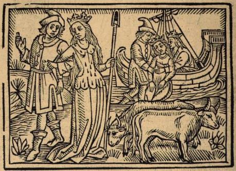 This engraving illustrates the beautiful Europa being kidnapped by Jupiter. Europa is depicted in the foreground of the engraving with a crown on her head and a long staff in her left hand. Boccaccio explains that Europa was following her father's heard of cattle to the shores of Phoenicia because a panderer had convinced her to do so. The panderer is depicted with his arm linked around Europa’s right arm while guiding her to the shore. The cattle are clustered around Europa’s feet. The background of the engraving depicts the kidnapping. The panderer lead Europa to a ship which carried Jupiter. Jupiter’s arms are depicted around the waist of Europa as he is lifting her onto the ship to take her to Crete.