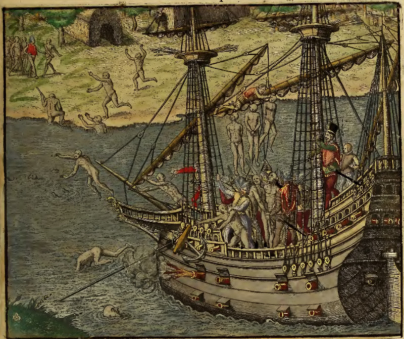 A large number of Indigenous people have been lured onto a Spanish ship by Diego d’Ocampo and his soldiers, in retaliation for an uprising against Spanish colonization in Venezuela. At least three Indigenous people have been hung from the mast of the ship. Several have escaped the ship by jumping overboard and swimming for shore, and some have reached the shore where they then flee the ship. The ship’s cannon is used to fire at those escaping. Two dwellings are visible near the shore. This image is identical to one found on page 181 of Frankfurt, 1594, but colored.