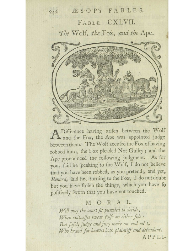 There are 3 animals, a wolf, fox and a ape. The fox and the wolf are facing eachother, while the ape is sat down leaned up against a tree, along with other plants scattered around. A difference has arisen between the fox and the wolf and the ape is the judge between them. The wolf accused the fox of stealing from him and the fox pleaded not guilty. The ape disbelieves the accusations of neither.