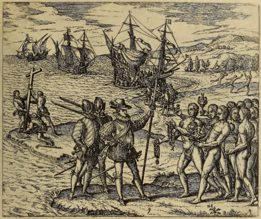 Christopher Columbus is shown standing on the shore of Hispaniola upon his first arrival there. A man, likely Columbus, stands arrogantly in front of two other Spaniards with his spear planted into the ground and one hand on his hip as he gazes at the people in front of him. A group of the island’s Indigenous inhabitants have approached him to offer gifts of jewelry and other treasures. On a spit of land behind Columbus, three Spaniards erect a large cross. Large Spanish ships are anchored along the coast in the background, with Spaniards coming ashore in rowboats. Several Indigenous people flee from the ships. This image is identical to one found on page 165 of Frankfurt, 1594.