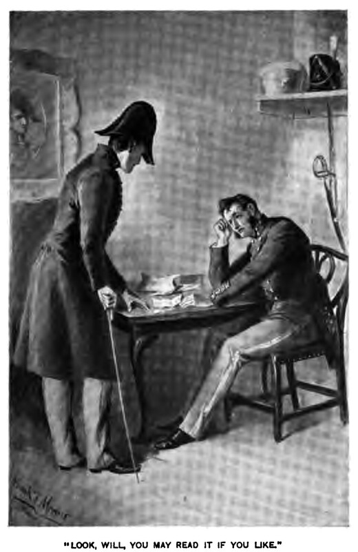 The image depicts a scene from page 170 in Chapter XVIII, in which George Osborne receives a package of the trinkets he gifted to Amelia Sedley. George Osborne is sitting in a wooden chair with his head in his right hand. In front of his is a table, piled with the papers and trinkets Amelia returned when her family went bankrupt. William Dobbin stands on the other side of the table, with one hand on it and the other holding his cane. Both men are dressed in their military uniforms, but only Dobbin is wearing a bicorn hat. In the background, a portrait of a man hangs on one wall. George’s sword hangs on the other wall, below a shelf holding his hat and a pot.