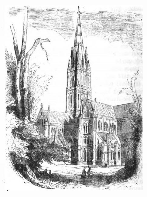 Here we see the great temple of Brobdingnag. The temple is built in the gothic architectural style of many European cathedrals. There is a large tower and two naves. In the foreground we see two giant couples walking among trees. The giants appear very small next to the church, showing the size and scale of the building. There are several large trees in the foreground. The same image appears in the 1839 Krabbe edition.
