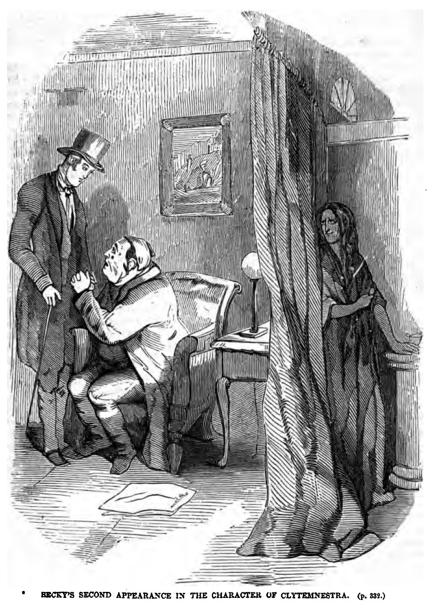 Joseph Sedley sits in a chair, begging William Dobbin, now his brother-in-law, to come and live near him, or else help him escape to India without Becky finding out. Dobbin was sent there by Amelia, who is worried about her brother after finding out that he has purchased a large life insurance policy. Behind a curtain on the far side of the room is Rebecca Crawley, listening in and holding a dagger in one hand. Below the illustration is printed its title and location in the story, “BECKY’S SECOND APPEARANCE IN THE CHARACTER OF CLYTEMNESTA. (p. 332.)”.