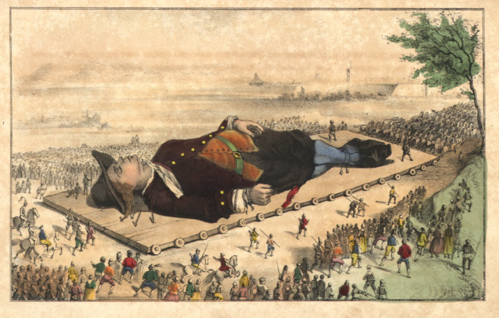 Here Gulliver is transported to the capital of Lilliput on a large gurney. The Emperor of Lilliput wanted Gulliver to be moved from the shore to the capital city and he asked for a large gurney to be built. The gurney was built to be seven feet long, four feet wide, and three inches thick, with twenty-two wheels. The gurney was attached to eighty ropes pulled by fifteen-hundred horses. Gulliver was given medicine to make him sleep while they made the journey from the shore to the capital. They reached the capital after a day and a half of marching – stopping overnight. During the night, five-thousand men stood guard.
