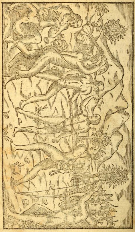 A group of Indigenous Tupinambá people is shown preparing to execute a captive man. The captive man is restrained by a rope tied around his waist, with two men holding either end of the rope, and his hand is raised in a gesture of protest against his impending death. Another man swings a club above the head of the captive. To the left a man lays on the ground with a woman kneeling next to him. To the right, a man stands holding a bow with one hand and gesturing with the other. A crowd of Indigenous people holding bows stands in the background.