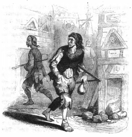Gulliver left the floating island of Laputa to go to Balnibarbi. He arrives and goes into the city of Lagado. He says it is about the size of London, however, most of the buildings had fallen into disrepair. The people often wore rags, walking quickly through the streets. There was also a distinct lack of agriculture despite the good quality of the land. In this image we see some of the locals of Balnibarbi walking through the streets. In the background we see houses that are falling apart. For example, on the right hand side we see a house whose walls are not straight, but are bowing out, and rubble underneath the window. The same image appears in the 1843 Krabbe edition.