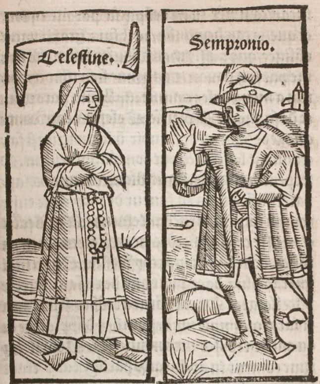The left panel depicts Celestina standing outside. She is wearing a robe and a veil, with what appears to be a rosary hanging from her waist. To the right we see Calisto’s servant Sempronio standing outside, wearing a hat. He has a sword mounted on his belt, which is partially concealed by his coat.The entire image is identical to the one found on page 70. The left panel is identical to the panel found on the title page, and on pages 146, 208, and 225 of the text. The right panel is nearly identical to those found on pages 187 (where it is labeled ‘Sepronio’ [likely a printing error]), 263 (labeled ‘Calisto’), 271 (labeled ‘Calisto’), 326 (labeled ‘Tristan’), and 350 (labeled ‘Pleberio’).