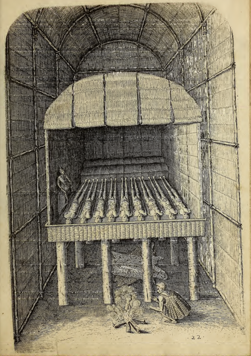 A tomb is shown, where the chiefs of this Indigenous group are laid to rest. The tomb sits inside a larger structure. It is set on thick logs that elevate it off the ground. The bodies of the chiefs are laid out side by side on a platform on top of the poles. Walls and ceiling enclose the bodies. At the base of the tomb a man crouches beside a fire.