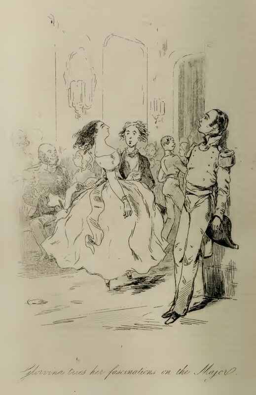 Miss Glorvina O’Dowd dances past Major William Dobbin, trying to get his attention at the King’s Regiment ball. He is leaning against the wall, holding his hat in his hand, and paying no attention. In the background are assorted other officers and their ladies. Below the illustration is printed in cursive its title, “Glorvina tries her fascinations on the Major”.
