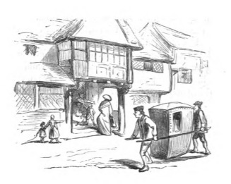 Here we see a street in England. The houses are built in the Tudor half-timbered style. Two men carry a sedan chair down the street. This image appears at the end of Part Three, when Gulliver has returned home to his family in England following his travels to Laputa, Balnibarbi, Glubbdubdrib, Luggnagg, and Japan.