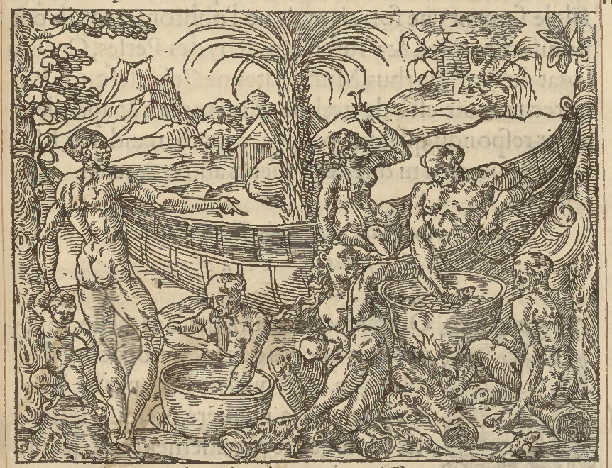 A group of Indigenous men, women, and children gather around two large pots, one sitting on the ground and one resting on a fire. The group cooks and eats meat and fish. Two individuals sit in a large hammock while the rest sit and stand on the ground around the pots. One structure is visible in the background.