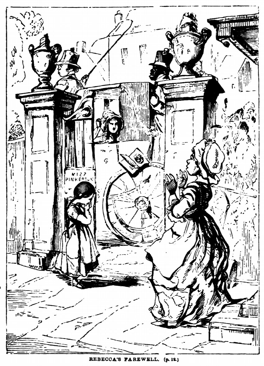 The image depicts two pillars topped with cups, between which is an open gate with a plate reading “Miss Pinkerton”. The pillars frame a carriage with very large wheels, at the front of which sits the coachman, holding his whip, and at the back of which stands Sambo. Rebecca Sharp’s face can be seen from the window of the carriage as she flings a book at the surprised Miss Jemima, who stands on the right side of the image at the bottom of the stairs. Next to the left pillar is a young girl with long braids, possibly Laura Martin, crying and covering her face with her hands. Below the illustration is printed its title and location in the story, “REBECCA’S FAREWELL. (p. 12.)”.
