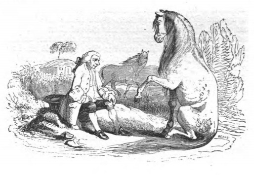 Here we see Gulliver sitting on a rock with a Houyhnhnm who sits on his haunches. In the background we see the Houyhnhnm’s house. The Houyhnhnm teaches Gulliver their language, which Gulliver learns and is able to converse with the Houyhnhnms. The same image appears in both the 1839 and 1843 Krabbe editions.