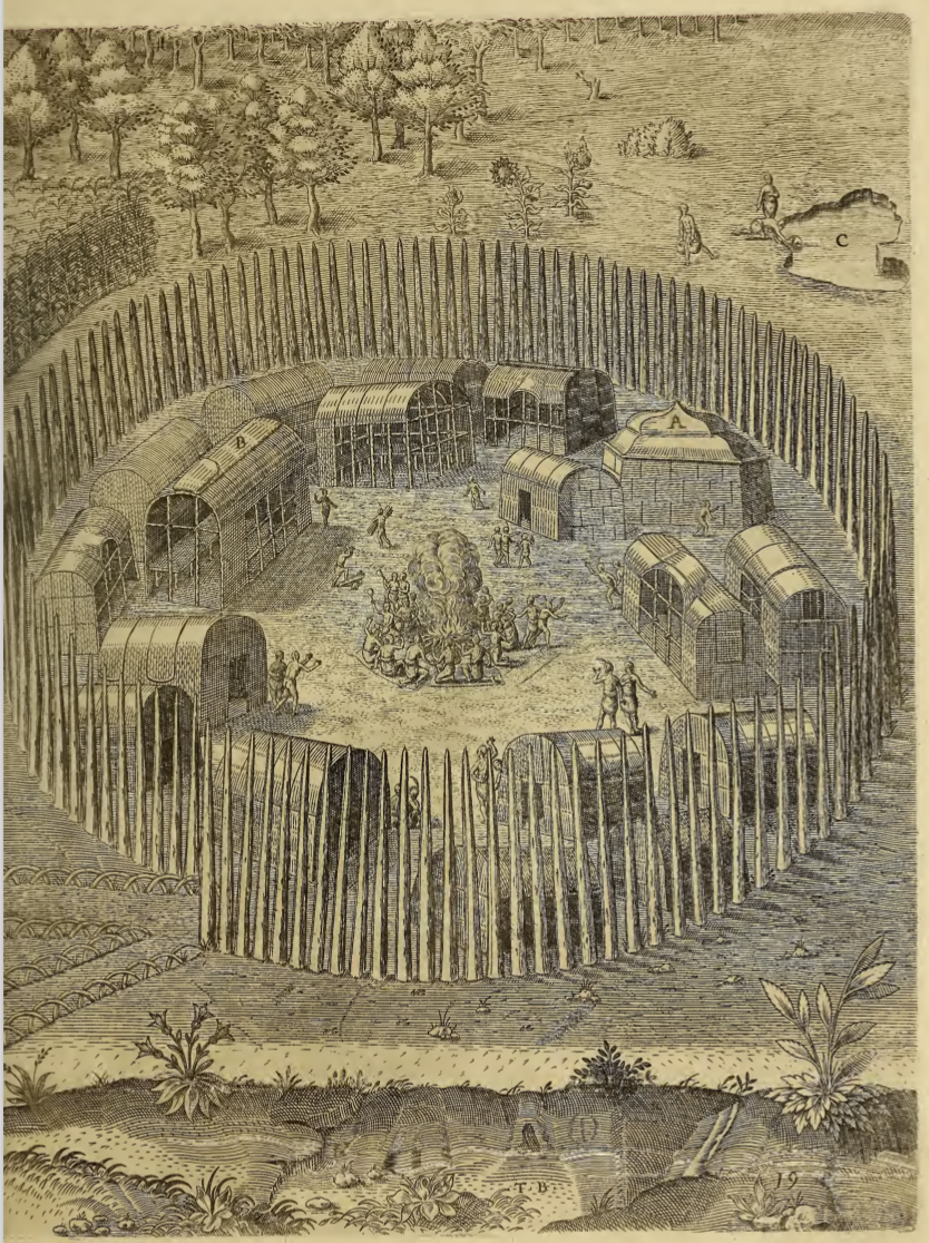 The Indigenous town of Pomeiooc is shown. Multiple structures are arranged in a circle. At the centre of the circle is a large bonfire, and surrounding the structures is a fence of tall poles stuck into the ground. There is one gap in the poles that serves as an entrance. There is a cornfield to the left of the village.