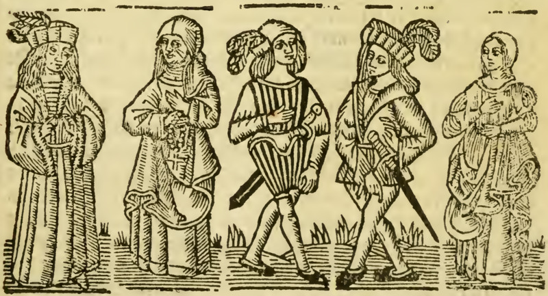 As Celestina (left-central figure) travels home from Melibea’s house, she sees Sempronio (central figure) and Pármeno (right-central figure) on their way to visit Calisto (leftmost figure) at Saint Mary Magdalene’s church. Sempronio and Pármeno enter first, and Celestina enters as they begin talking with Calisto. She tells Calisto that she has good news, and the four of them go to Calisto’s house for more privacy. Celestina tells him that Melibea has revealed her love for him, and informs him that she has requested to meet at midnight. Overjoyed, Calisto praises Celestina for her work, but Sempronio and Pármeno express skepticism at Melibea’s dramatic change of heart. Calisto tells everyone he is going to take some rest before midnight arrives, and Celestina returns home, where she is greeted by Elicia (rightmost figure). [The figures in this illustration are used in multiple other illustrations throughout this edition.]