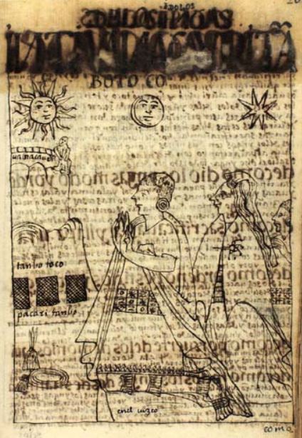 This chapter is dedicated to describing the idols and gods of the Incas. This image depicts the Inca Emperor kneeling before their major deities, uana cauri [Huanacauri], tanbo toco [Tambotoco], and pacari tanbo [Pacaritambo]. Huanacauri is a mountain and Pacaritambo is a cave where the first Incas allegedly originated from. The Tambotoco were three niches in the cave. The three niches are depicted at the base of Huanacauri. The author explains that when the Inca is crowned as king, he must honour the deities and make sacrifices to them, which is what this image depicts. His wife and child are standing behind him to help perform the sacrifices to honour the idols. There is a sun, moon and star illustrated at the top of the image, which the Incas also venerated. The words “en el cuzco” are written at the bottom of the image which translates to “in Cusco.”