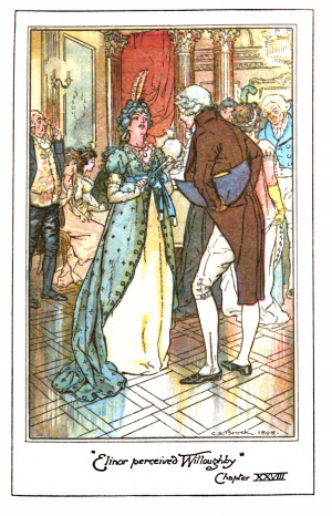 Here we see Willoughby speaking with Miss Grey at a party. Elinor is visible sitting on the left of the image looking at Willoughby. Marianne sits next to Elinor, not yet noticing Willoughby, and Sir John stands next to them. Marianne wrote to Willoughby after arriving in London, hoping to see him but he ignored her letters. At a party Elinor noticed Willoughby speaking with a woman. He came over to the sisters and spoke to Elinor briefly, ignoring Marianne. Outraged, Marianne asked Willoughby if he had received her letters, to which he said he had, and then hurried away. Marianne was heartbroken and the sisters left the party early and Marianne spent the rest of her time in London miserable. It was later revealed that the woman Willoughby was speaking to at the party, shown in this image, was Miss Grey, a wealthy heiress. Willoughby was not rich and liked to live beyond his means, and hence wanted to marry rich to support his lifestyle. Miss Grey did not approve of Marianne’s letters, and dictated Willoughby’s letter to Marianne in which he said he never loved her. This scene appears in chapter 28 as indicated underneath the image. The characters are shown in the traditional regency style. Miss Grey wears the regency style dress with an empire waist. Because it was an evening party, she wears short sleeves and gloves that come above her elbows. She holds a fan in her hand. A fan in this era was often used to signal to communicate with others at the party. Using the fan, a woman could signal if she was married, single, or engaged, that she was being watched by a chaperone, that she loved another man, among other things. Her hair is worn tied up, as was tradition for women after their “coming out” before the queen, signaling her entrance into society. Willoughby wears a waistcoat, tailcoat and knickers that stopped at the knee, and holds a bicorn hat under his arm. The regency period dated to the early nineteenth century (1811-1820) when George, Prince of Wales, later George IV (r. 1820-1830), reigned as regent for his mentally ill father, King George III (r. 1760-1820). The regency period is associated with the rise of neoclassicism in art and fashion.