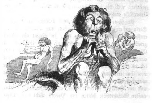 Gulliver’s master explained various aspects of the Yahoos that lived in the Country of the Houyhnhnms. He explained that the Yahoos would eat anything, including herbs, berries, roots, and the flesh of other animals, seen here. He also said that they would kiss each other, seen in the background, a concept that disgusted him. The same image appears in the 1843 Krabbe edition.