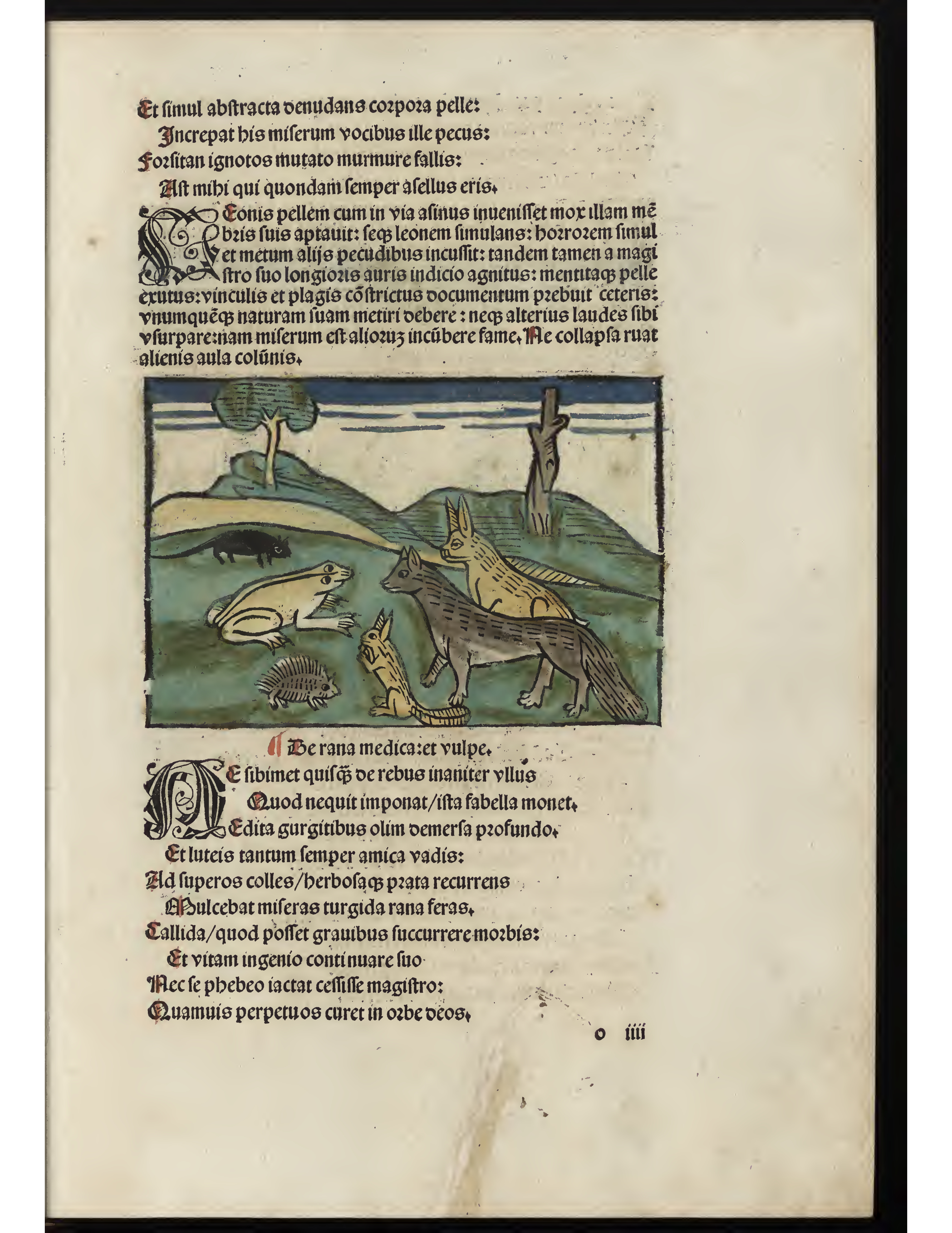 - A group of animals; a cat, a hedgehog, a squirrel, a rabbit, and a fox are gathered around a frog. There are trees in the background, green grass, and blue sky above the animals. The animals are interested in what the frog is saying.