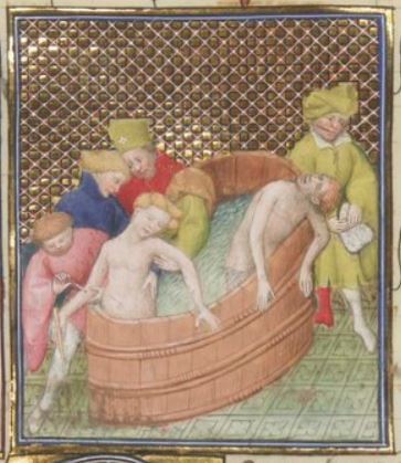 This illumination depicts Seneca and his wife Pompeia Paulina committing suicide in a bathtub. After Emperor Nero found out that Seneca (his tutor) was involved in the conspiracy to assassinate him, he forced a centurion to command Seneca to commit suicide. Not wanting to live without her husband, Pompeia Paulina got into the tub along with Seneca and slit her arm to die with him. Seneca is depicted dead in the image; however, servants are illustrated saving Paulina by tying a rope around her arm to stop the flow of the blood. Emperor Nero did not want Pompeia Paulina to die as he had nothing against her, which is why the servant saved her life.