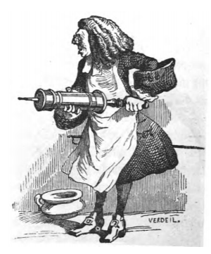 Gulliver explains the various medicines used in England to treat disease. In this image we see a doctor holding a large needle. The image represents a doctor giving a patient an enema. We also see a chamber pot on the floor next to the doctor. The same image appears in the 1839 Krabbe edition.