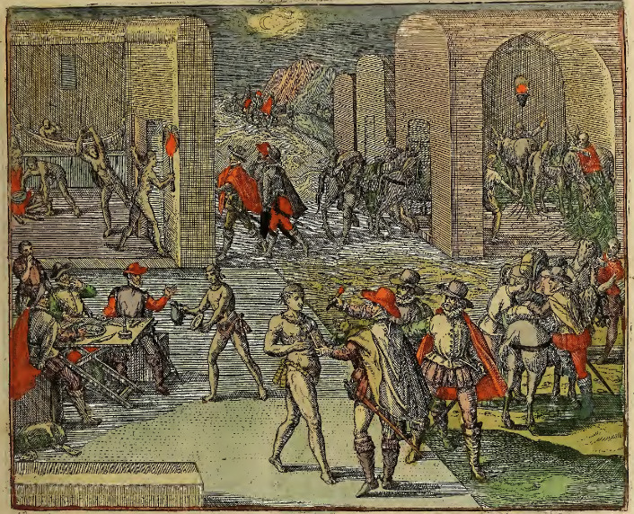 A group of Spanish merchants, including Girolamo Benzoni, ran out of food while crossing part of Panama and were forced to seek help from a group of Indigenous people they encountered, and stayed a night in their village. The Indigenous people were very hospitable to the Spaniards. Their horses and mules are stabled in a structure on the right, while several Spaniards are shown to sleeping quarters with hammocks and a fire on the left. Three Spaniards are served food and drink at a table on the left, and nearby an Indigenous man converses with several more Spaniards. The text indicates that, out of gratitude to the Spaniards for not enslaving them, the Indigenous people provided the group with fish, fruit, bread and meat for the rest of their journey. This image is identical to one found on page 141 of Frankfurt, 1595, but colored.