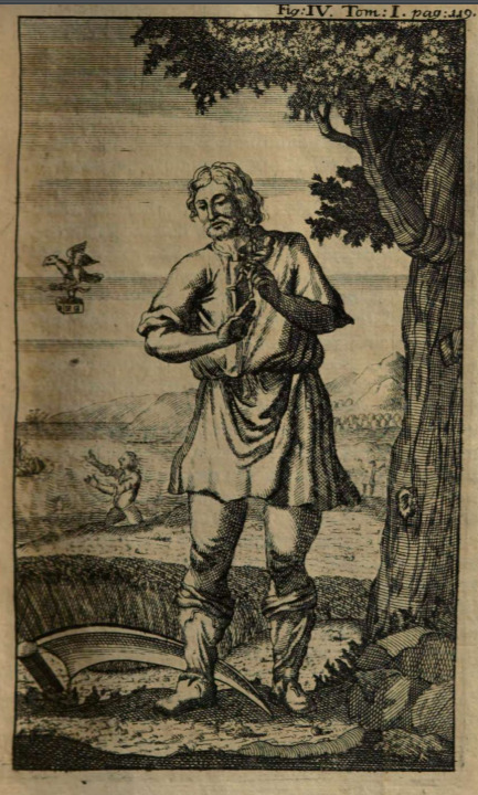 This image represents Gulliver’s adventures in Brobdingnag. The central figure is the farmer who first discovered Gulliver, standing under a tree. The Giant holds Gulliver in his hand, showing the reader the difference in size between Gulliver, and the Giants of Brobdingnag. In the background, we see an eagle carrying a box, depicting the episode in which Gulliver left Brobdingnag, as the box in which he lived and travelled was picked up by an eagle, and carried over the open water, before the eagle dropped Gulliver into the ocean, later to be discovered by a ship. We see another giant in the background, close to the water, presumably the page who left Gulliver’s box unattended, thus allowing it to be picked up by the eagle.