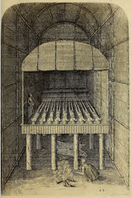 A tomb is shown, where the chiefs of this Indigenous group are laid to rest. The tomb sits inside a larger structure. It is set on thick logs that elevate it off the ground. The bodies of the chiefs are laid out side by side on a platform on top of the poles. Walls and ceiling enclose the bodies. At the base of the tomb a man crouches beside a fire.