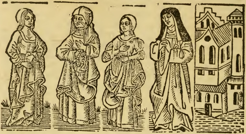 Lucrecia (right-central figure) brings Celestina (left-central figure) to Melibea’s house. There, Melibea (leftmost figure) tells Celestina of her love for Calisto. Alisa (rightmost figure) overhears Melibea and Celestina talking. Celestina walks past Alisa on her way out, and Alisa asks her the purpose of the visit. Celestina claims that she was short on yarn the day before and felt she had to return to make up the deficit. Alisa then asks Melibea the same question, and Melibea answers that Celestina sold her sublimated mercury. Suspicious of the difference in answers, she warns Melibea against dealing with Celestina again, citing her immoral and dishonest ways, as well as the ill that befalls those who entertain her presence.[The figures in this illustration are used in multiple other illustrations throughout this edition.]