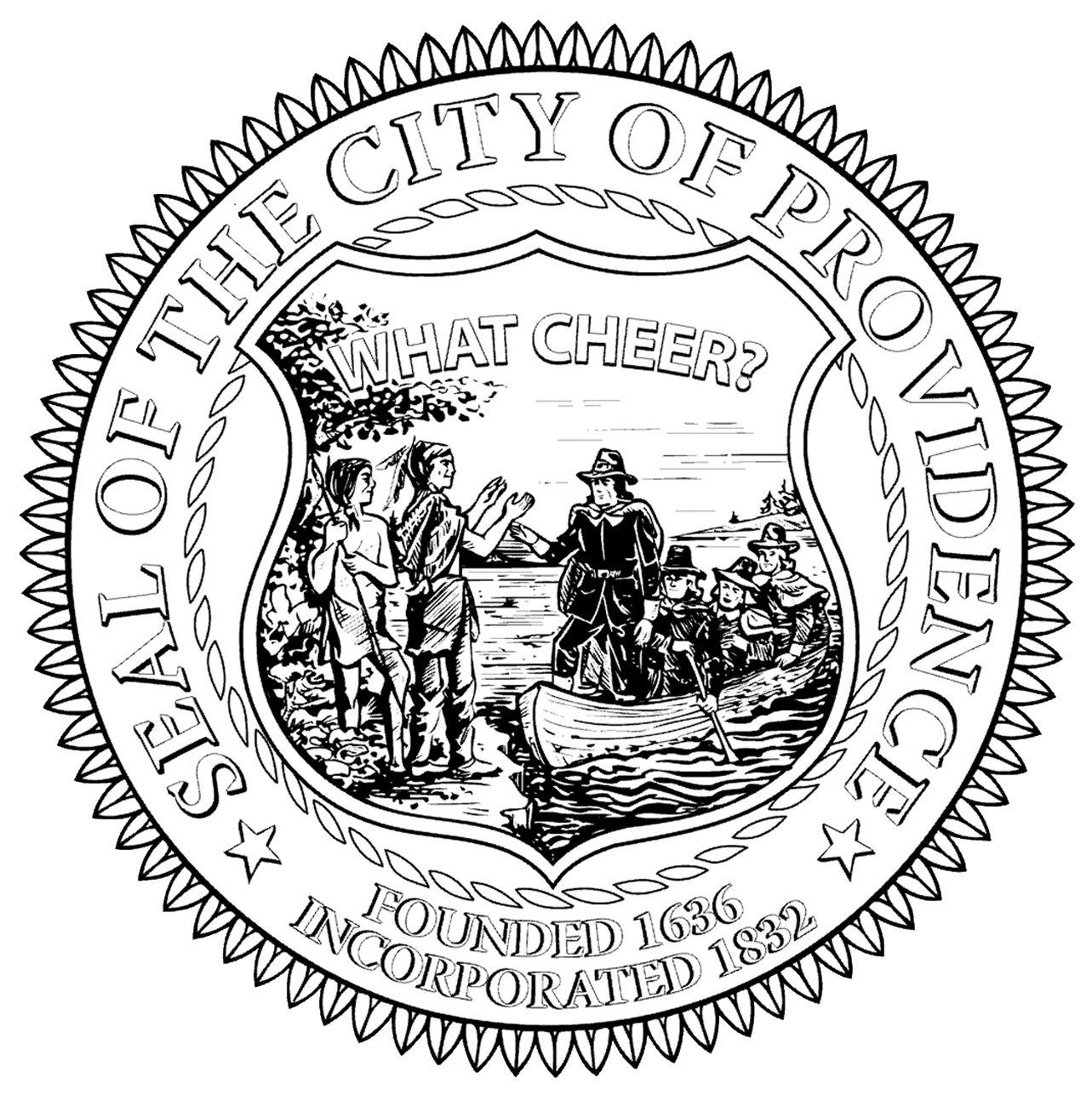- "SEAL OF THE CITY OF PROVIDENCE" "FOUNDED 1636 INCORPORATED 1832" "WHAT CHEER?