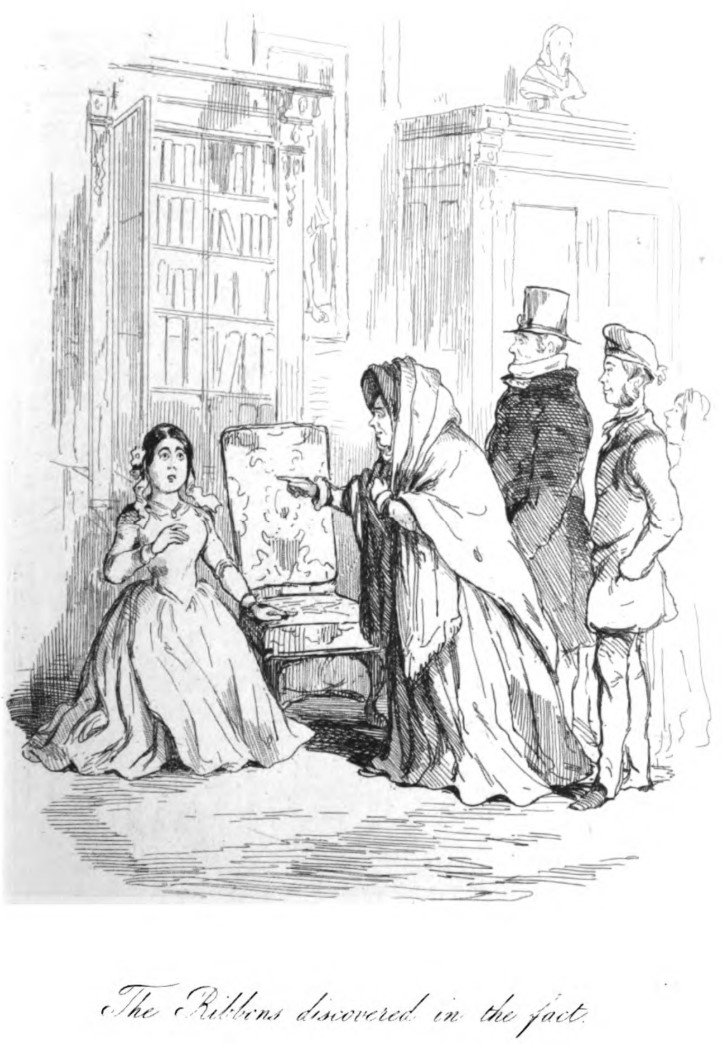 Miss Betsy Horrocks, with large ribbons in her hair, kneels in shock next to a chair in Sir Pitt Crawley’s study. Mrs. Martha Crawley, who has just caught Miss Horrocks trying a stolen set of keys on the locked drawers in the room, points an accusing finger at her. Behind her are Reverend Bute Crawley, her husband, and James Crawley, their son, who have both also witness the robbery. Below the illustration is printed in cursive its title, “The Ribbons discovered in the fact”.