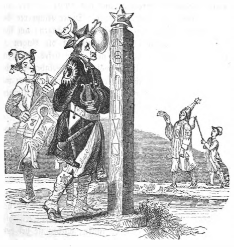 Here we see a Laputan scholar about to run into a post because he is so deep in thought he becomes unaware of his surroundings. His Flapper gently taps his eyes with a blown bladder filled with peas or pebbles to warn him that he will hit the post. The Laputans wear clothes with astronomical and musical motifs. On the post there are mathematical and geometric motifs. The Flapper walks behind the scholar and holds the bladder over one shoulder. In the background of this image we see another scholar with his Flapper. The Laputans’ faces were not symmetrical, with their heads tilting to one side, and one eye turning inwards and the other looking straight up. The same image appears in the 1839 Krabbe edition.